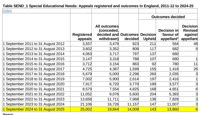 The Ministry of Justice publishes special educational needs tribunal statistics in December each year. December 2025 can be found on a spreadsheet via this page. The headline points are here.
