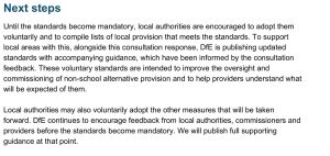 Chapter 4 of the consultation document proposes that unregistered alternative providers delivering special educational provision under EOTAS arrangements for children not on a school admission register would a) be required to register with the Department for Education; b) would need to comply with new national standards and; c) would be subject to periodic national inspections by an independent body appointed by the Department.